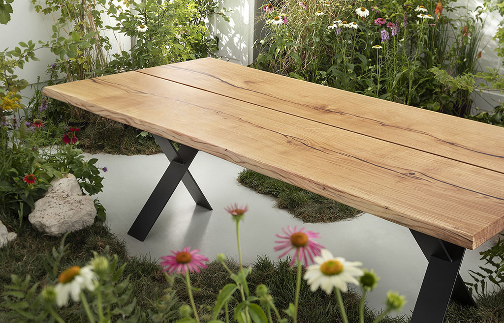 Tammi-, saarni- ja saksanpähkinälevyt rakentuvat esineiksi, joiden muotoilu on uniikki – kuten puunrungot, josta ne ovat peräisin. Tyylikkäinä vastakohtina metalli ja teräs tukevat kokonaisuutta ja muotoa.